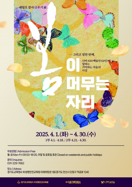경기도교육청4.16생명안전교육원 미래희망관 1층에서 열리는 이번 전시는 경기도교육청4.16생명안전교육원, 4.16기억저장소, 나비416이 공동으로 주최·주관하는 행사다.