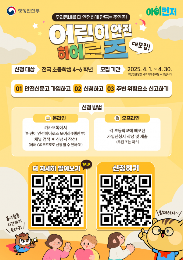 [한국Q뉴스] 행정안전부는 4월 1일부터 30일까지 ‘어린이 안전히어로즈’를 신규 모집한다고 밝혔다.