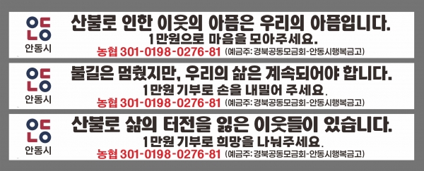 이에 안동시는 시민의 마음을 하나로 모아 함께 극복해 가자는 취지로 시내 전 지역에 산불로 터전을 잃은 이웃들을 위한 성금 모금 현수막을 게시하며 시민의 관심과 동참을 호소하고 있다.