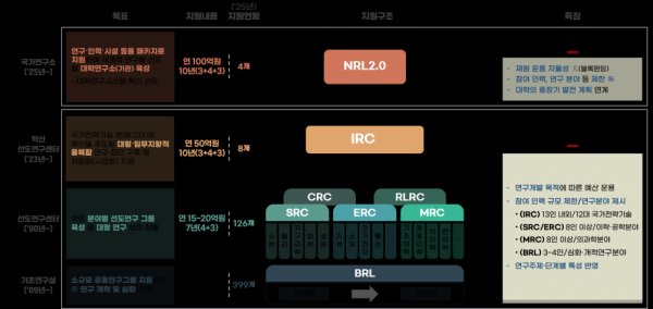 우리나라 집단연구는 ’90년 과학기술정보통신부의 우수연구센터 사업을 통해 본격적으로 시작되어 현재의 다양한 지원체계를 갖추게 됐다.