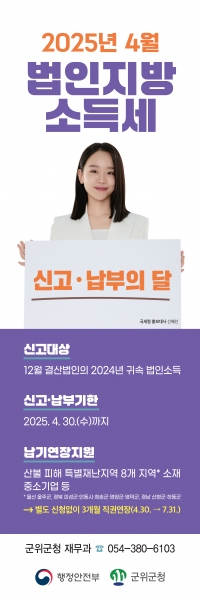 신고대상은 전년도 12월 결산법인으로 2024년 귀속 법인소득에 대해 세무서에 신고하는 법인세와 별도로 법인지방소득세를 오는 4월 30일까지 군위군에 신고·납부해야한다.
