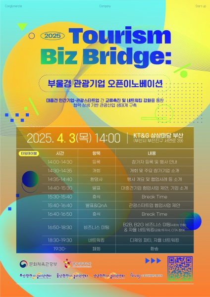 [한국Q뉴스] 한국관광공사는 4월 3일 KT&G 상상마당 부산에서 ‘2025 Tour Biz Bridge: 부울경 관광기업 오픈이노베이션’을 개최했다.