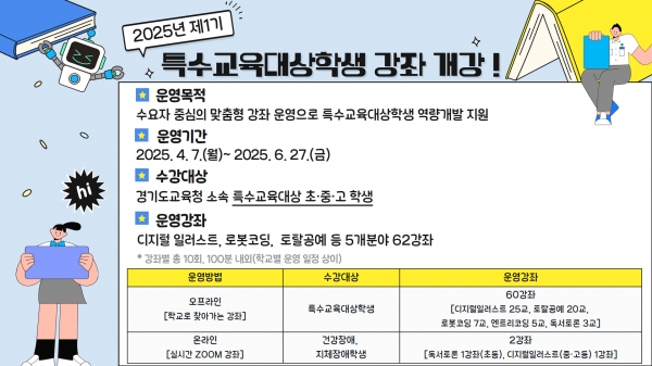 4월 7일부터 6월 27일까지 진행하는 이번 강좌는 특수교육학생을 대상으로 다양한 분야의 교육 기회를 지원하고자 마련됐다.
