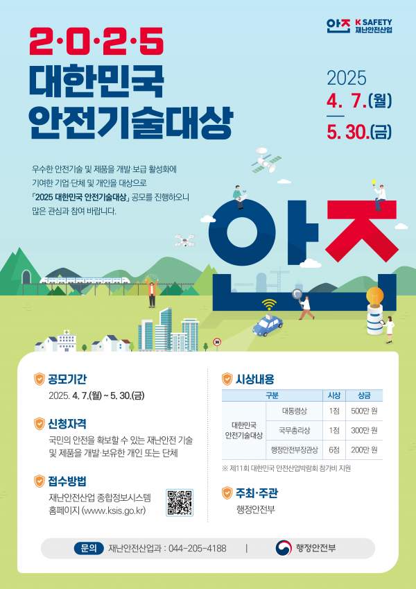 [한국Q뉴스] 행정안전부는 4월 7일부터 5월 30일까지 ‘2025 대한민국 안전기술대상’ 후보를 공모한다고 밝혔다.