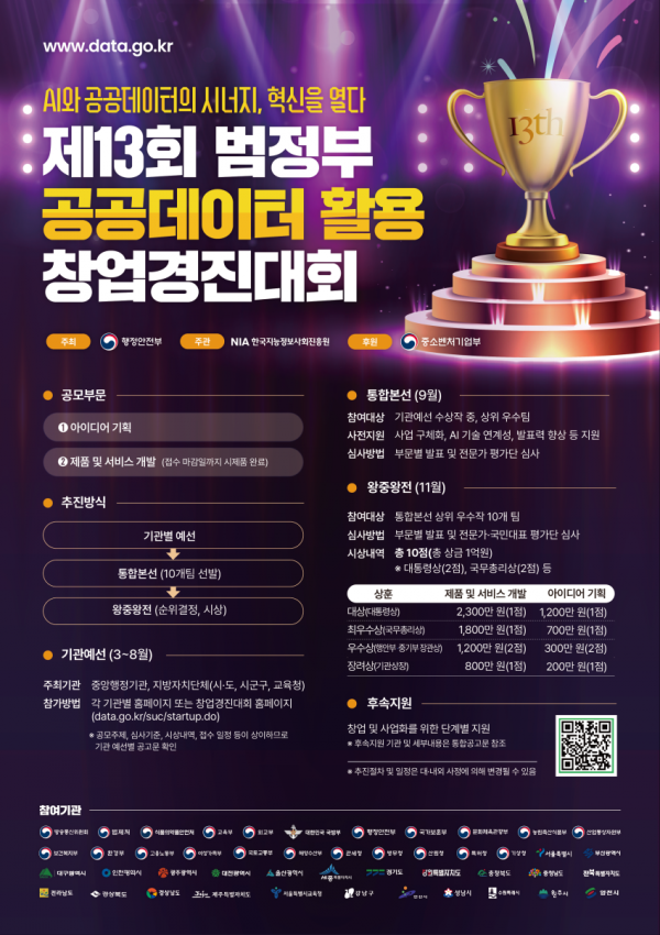 [한국Q뉴스] 행정안전부는 48개 기관 예선을 시작으로 ‘제13회 범정부 공공데이터 활용 창업경진대회’를 개최한다고 밝혔다.