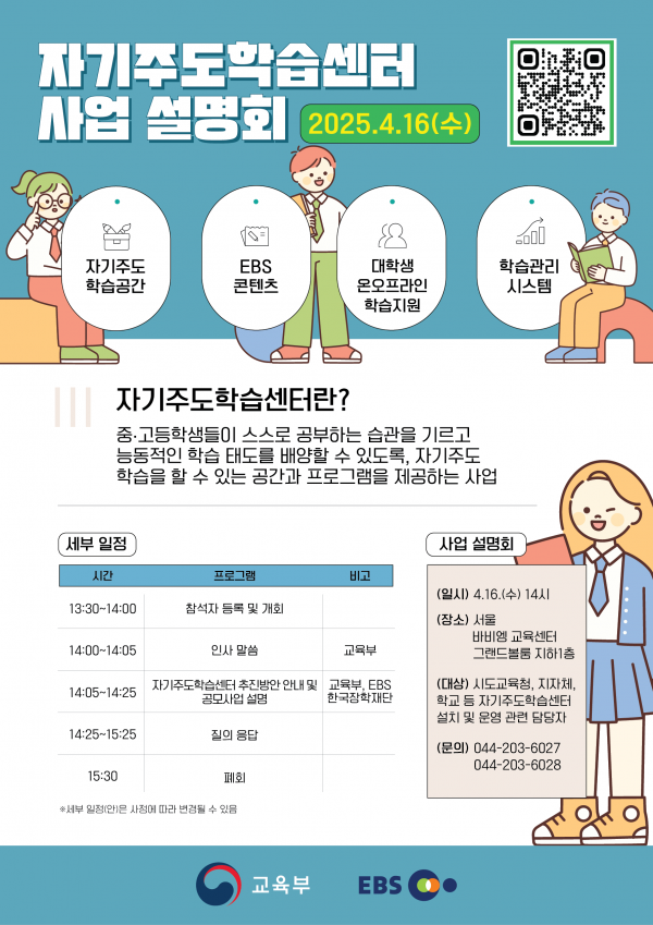 [한국Q뉴스] 교육부는 4월 10일부터 6월 5일까지 시도교육청을 대상으로 자기주도 학습센터 신규 선정 공모를 실시한다.