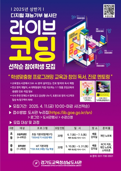 [한국Q뉴스] 경기도교육청성남도서관이 오는 11일부터 ‘2025 상반기 라이브 코딩 프로그램’ 참여 학생을 모집한다.