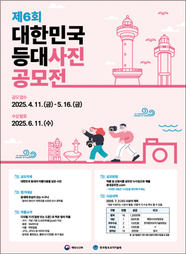 강도형 해양수산부 장관은 “이번 공모전에 참여해 역사와 문화를 담고 있는 대한민국 등대의 아름다움과 가치를 발견하고 수상의 기쁨까지 누릴 수 있기를 바란다”고 말했다.