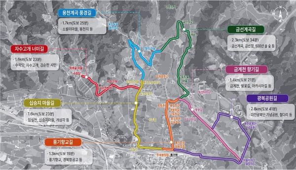 특히 십승지마을, 금선계곡, 풍기향교, 광복공원, 수락당 등 풍기읍의 주요 명소를 자연스럽게 연결하는 둘레길로 설계되어 주민들에게는 건강과 여가를 위한 힐링 공간이자, 관광객에게는 풍기읍을 깊이 있게 체험할 수 있는 도보 여행 코스로 자리매김할 전망이다.