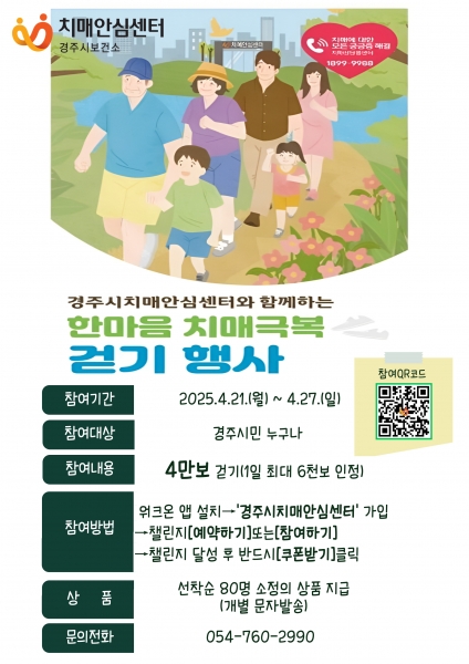 [한국Q뉴스] 경주시 치매안심센터는 치매에 대한 사회적 공감대 형성과 극복 의지 확산을 위해 오는 21일부터 27일까지 모바일 앱 ‘워크온’을 활용한 ‘2025년 한마음 치매극복 걷기행사’를 개최한다고 밝혔다.