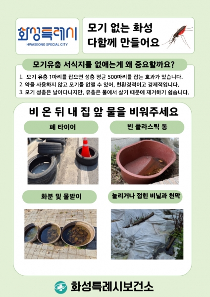 특히 화분 받침이나 빗물받이에 고인 물 등 작은 물웅덩이에서도 모기 유충이 쉽게 자랄 수 있는 생태적 특성을 반영해, 시민이 직접 방제에 참여하는 ‘비 온 뒤 내 집 앞 물 비우기’ 실천을 적극 홍보하며 통합적 매개체 관리 정책을 추진하고 있다.