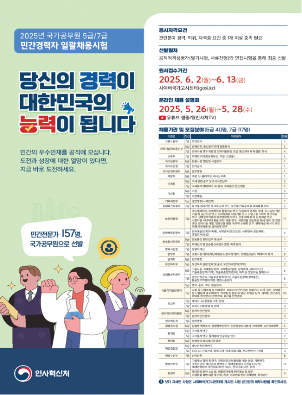 인사혁신처는 ‘2025년도 국가공무원 5·7급 민간경력자 일괄채용시험 시행계획’을 사이버국가고시센터에 공고했다고 18일 밝혔다.