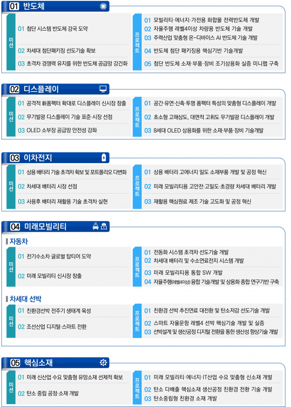 초격차 기술 분야에서는 지난해 11월 예비타당성 조사를 통과한 총 사업비 1조원 규모의 첨단반도체 양산연계 미니팹 기반구축, 세계 최고수준 주행이 가능한 전기차 구동시스템 및 5분 급속충전 배터리, 중대형 선박 블록 자동 핸들링 및 지능형 용접, 희귀·난치성 질환에 대응한 세포·유전자 치료제 유전자 치료제 제조공정 기술개발 사업 등을 선정했다.