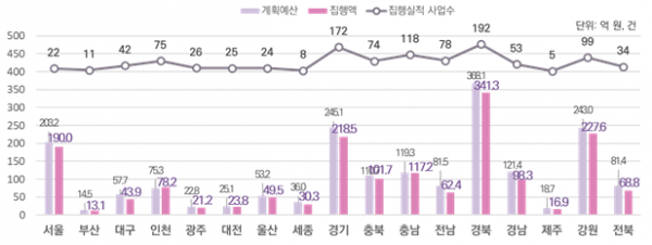 또한, ’ 23~’ 25년 기간 동안 중앙부처 중에서는 국토교통부가 137건, 7,707억원 규모의 사업을 추진해 가장 적극적으로 투자했고 광역지자체 단위에서는 경북, 경기, 서울 순으로 많은 투자를 시행했다.