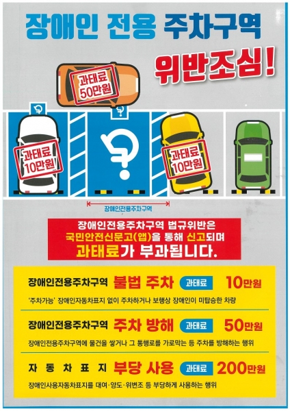 이날, 장애인전용주차구역을 위반하려는 운전자는 계도하는 한편 장애인일자리사업 참여자들과 함께 장애인전용주차구역 위반 주의와 과태료 기준을 안내하는 리플릿과 홍보물을 배부했다.