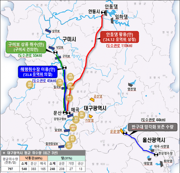 그간 대구-경북 취수원 이전 대책으로 구미 해평취수장 공동이용안, 안동댐 활용방안 등이 제안되었으나, 관련 지자체간 이견 등으로 현재까지 추진되지 못하고 있다.