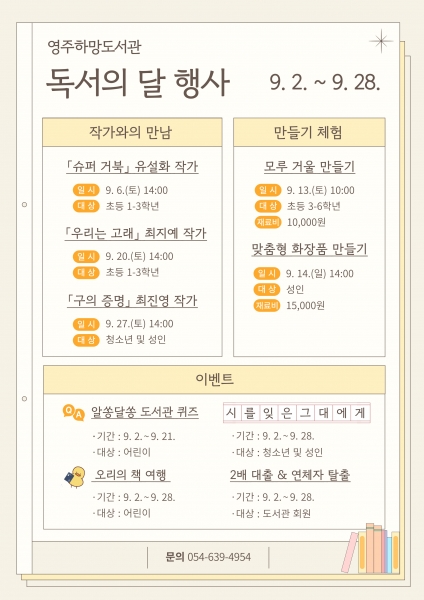 [한국Q뉴스] 영주하망도서관은 9월 ‘독서의 달’을 맞아 지역의 독서 문화 확산을 위해 오는 9월 2일부터 9월 28일까지 다채로운 프로그램을 운영한다고 밝혔다.