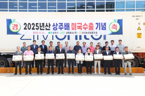 [한국Q뉴스] 상주시 외서농협 대미배수출단지는 8월 21일 오후 2시 외서농협 농산물산지 유통센터에서 강영석 시장, 지역구 도·시의원, 생산단체 및 수출관계자 30여명이 참석한 가운데 2025년産 배를 미국으로 수출했다.