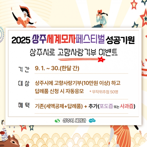 [한국Q뉴스] 상주시는 9월 한 달 동안 2025 상주세계모자페스티벌의 성공 개최를 응원하고 고향사랑기부제 홍보와 기부문화 조성을 위한 ‘상주시로 고향사랑기부 이벤트’를 진행한다.