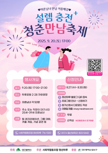 [한국Q뉴스] 대구광역시는 오는 9월 20일 오후 5시, 두류공원 2.28자유광장에서 올해 미혼남녀 만남 행사의 대미를 장식할 ‘청춘 만남 축제’를 개최한다.