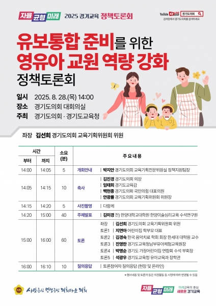 토론회를 주관하는 김선희 의원은 “이번 정책토론회를 통해 앞으로 경기도교육청이 영유아 유보통합의 모범사례를 만들어 다른 시·도 교육청이 벤치마킹할 수 있도록 하겠다”며 “경기도의회 2025년 경기도교육청에 대한 행정사무감사 및 2026년도 경기도교육청 예산안 심사에서 경기도교육청의 영유아 유보통홥 추진에 대해 지속적으로 개선책을 내놓겠다”고 밝혔다.
