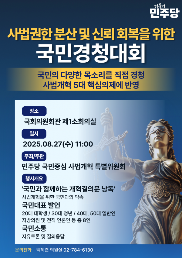 [한국Q뉴스] 더불어민주당 국민중심 사법개혁 특별위원회는 오는 27일 국회의원회관 제1소회의실에서 ‘사법권한 분산 및 신뢰 회복을 위한 국민경청대회’를 개최한다.