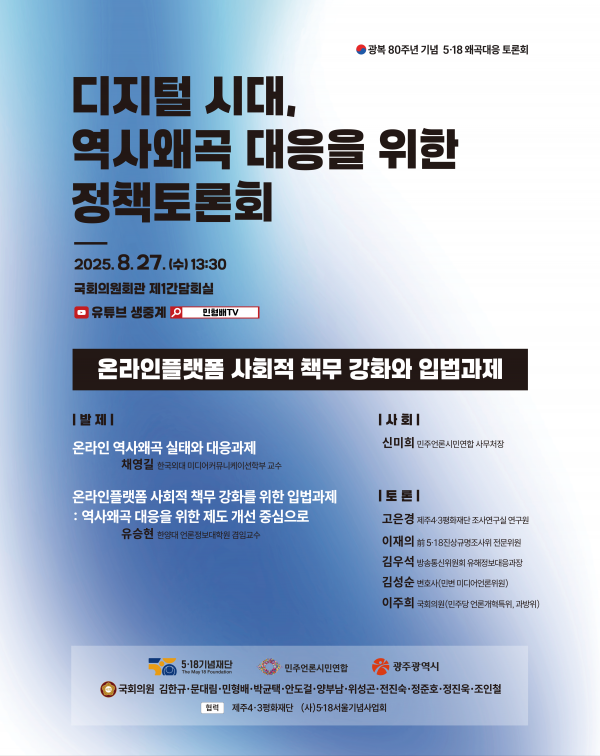 5·18기념재단과 민주언론시민연합, 광주광역시, 국회의원 민형배 등 광주·제주 지역 의원 11인, 김한규·문대림·위성곤)은 8월 27일 오후 1시 30분, 국회의원회관 제1간담회실에서 ‘디지털 시대, 역사왜곡 대응을 위한 정책토론회’를 공동 개최한다.