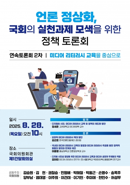 [한국Q뉴스] 더불어민주당 김승원 국회의원은 오는 8월 28일 국회 의원회관 제1간담회의실에서 ‘언론 정상화, 국회 실천과제 모색’ 제2차 정책 토론회를 개최한다.