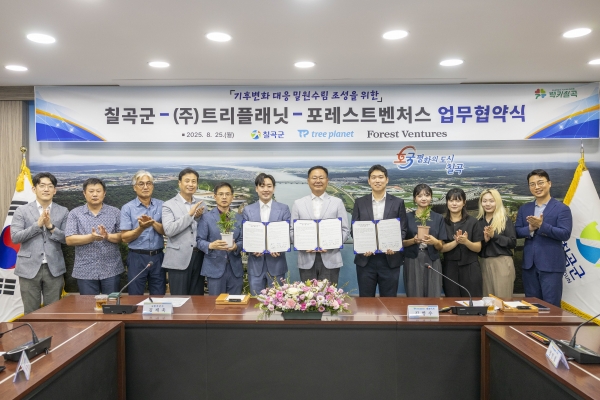 [한국Q뉴스] 칠곡군은 지난 25일 트리플래닛, 포레스트벤처스와 기후변화 대응 밀원수림 조성을 위한 업무협약을 체결했다.