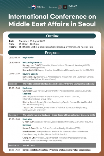 [한국Q뉴스] 외교부는 8.28. 서울대학교 아시아연구소와의 공동 주관 하 ‘서울 중동문제 국제회의’를 개최했다.