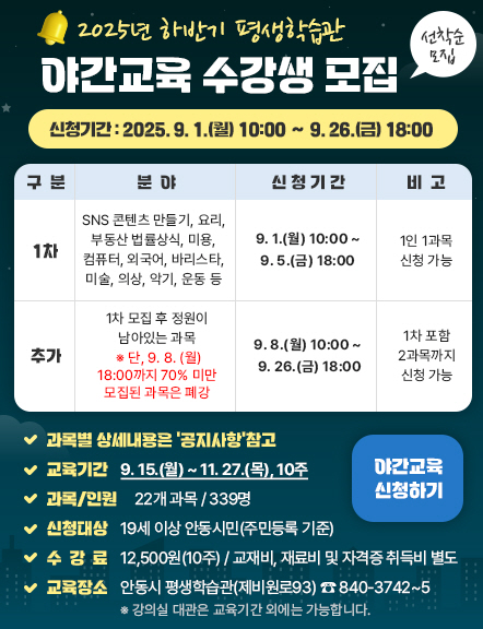 [한국Q뉴스] 안동시 평생학습관은 오는 9월 1일부터 2025년 하반기 야간교육 수강생을 모집한다.