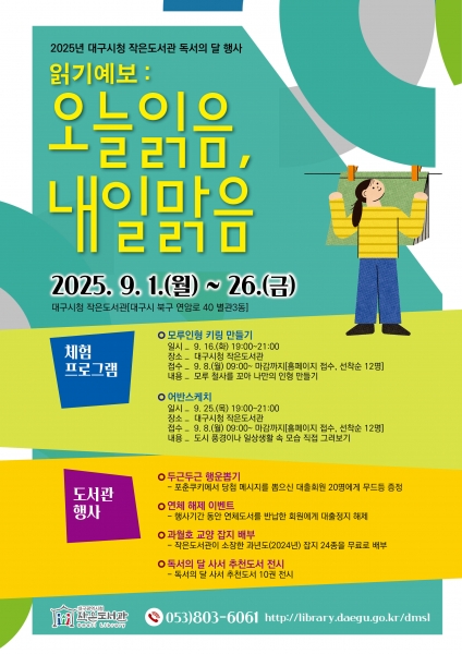 [한국Q뉴스] 대구광역시청 작은도서관은 9월 ‘독서의 달’을 맞아, 9월 1일부터 26일까지 4주간 ‘읽기예보: 오늘읽음, 내일맑음’ 이라는 주제로 시민을 위한 다양한 독서문화 행사를 운영한다.