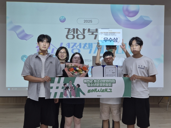 [한국Q뉴스] 예천군은 지난 8월 30일 안동시청소년수련관에서 열린 ‘2025 경상북도청소년정책제안대회’ 본선에서 예천군청소년문화의집 청소년운영위원회가 우수상을 수상했다고 2일 밝혔다.