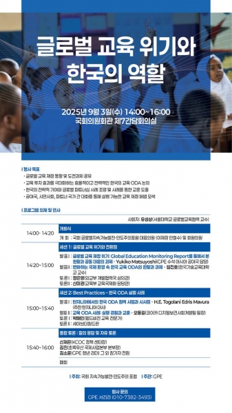 특히 이번 토론회에서는 국회 · 국제기구 · 정부 등 ODA 주요 관계자가 한자리에 모여 , 글로벌 교육 위기 속에서 한국의 교육 ODA 가 나아가야 할 전략을 모색할 예정이다.