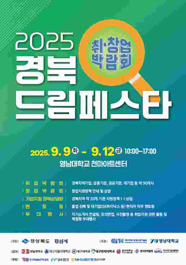 [한국Q뉴스] 경상북도와 경산시가 주최하는 ‘2025 경북 드림페스타’ 가 9일부터 12일까지 4일간 영남대학교 천마아트센터 일원에서 개최된다.