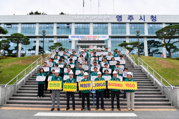 영주시 부서장과 읍·면·동장이 참여한 이날 캠페인은 시청 전정에서 “안전은 지키GO, 책임은 다하GO, 중대재해는 막GO”라는 구호를 제창하고 카드섹션 퍼포먼스를 통해 안전문화 확산의 필요성을 알렸다.