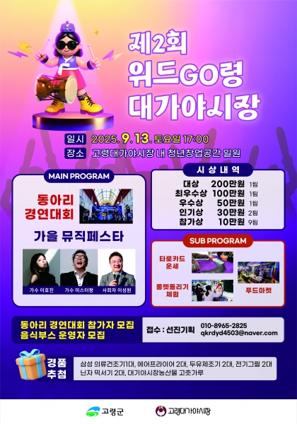 13일 오후 5시부터 고령대가야시장 청년창업공간 일원에서 열리는 ‘위드GO령 대가야시장’에는 대구·경북권 14개 팀이 참가하는 동아리 경연대회를 메인행사로 인기가수가 함께하는 가을 뮤직페스타, 푸드존, 플리마켓, 고객 체험행사 등 다양한 볼거리와 즐길 거리로 채움으로써 초가을 밤을 지역과 세대를 뛰어넘는 지역민의 재능과 열정, 화합의 장으로 가득 채울 예정이다.