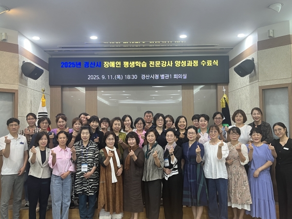 [한국Q뉴스] 경산시는 11일 수강생과 관계자 등 40여명이 참석한 가운데 “2025년 장애인 평생학습 전문강사 양성과정”수료식을 가진 뒤 교육생에게 수료증을 전달했다고 밝혔다.