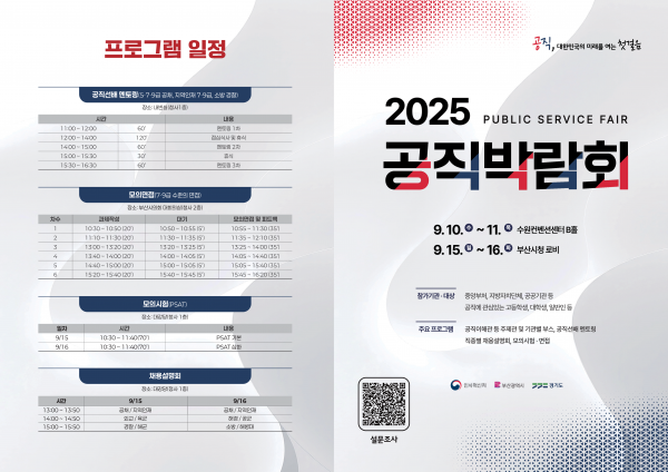 인사혁신처는 중앙행정기관, 지방자치단체, 공공기관 등이 참여해 다양한 공직 채용 정보를 제공하는 ‘2025 공직박람회’를 15일부터 16일까지 이틀간 부산시청 1, 2층에서 개최한다고 밝혔다.