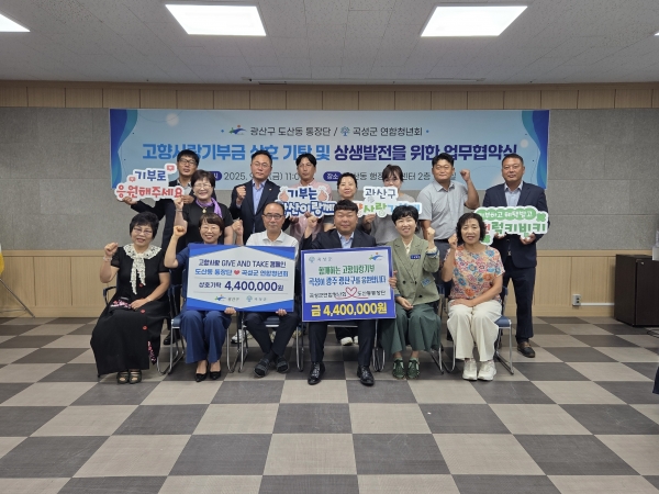 [한국Q뉴스] 곡성군은 지난 12일 광주 광산구 도산동 행정복지센터에서 광산구 도산동 통장단과 전라남도 곡성군연합청년회가 ‘고향사랑기부제 활성화를 위한 상생 협약’을 체결했다고 15일 밝혔다.