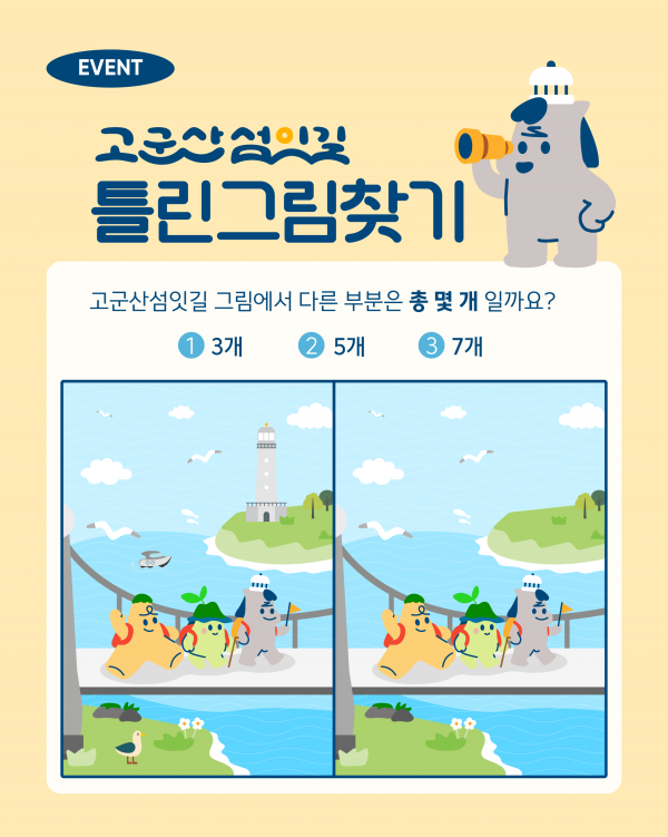 참여 방법은 고군산섬잇길의 아름다운 풍경과 캐릭터들이 등장하는 2개의 그림 가운데 틀린 부분의 개수를 센다 댓글을 남긴다 해당 게시글에 ‘좋아요’를 누르고 공식 계정을 팔로우하면 된다.