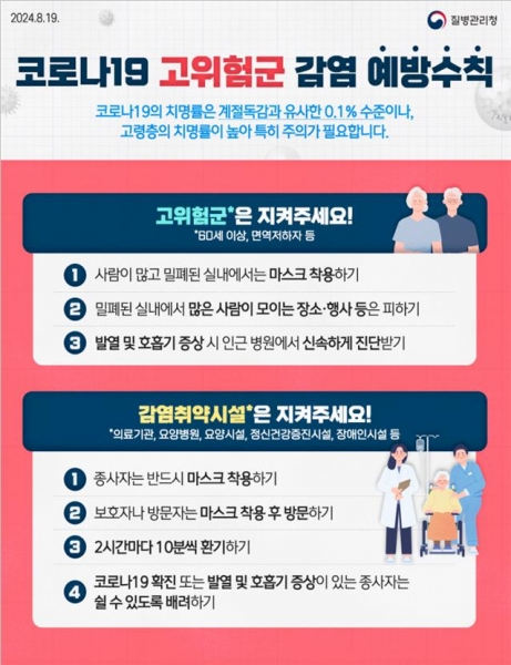 군 보건소 관계자는 “9월에도 코로나19 확산세가 지속되고 있으므로 특히 어르신 등 고위험군은 사람이 많이 모이는 실내 행사 참여를 자제해 주시고 참여 시에는 마스크를 착용해 주시길 바란다”며 “환절기 코로나19 감염 예방을 위해 일상 속 호흡기 감염병 예방수칙 생활화에 군민의 적극적인 협조가 필요하다”고 당부했다.