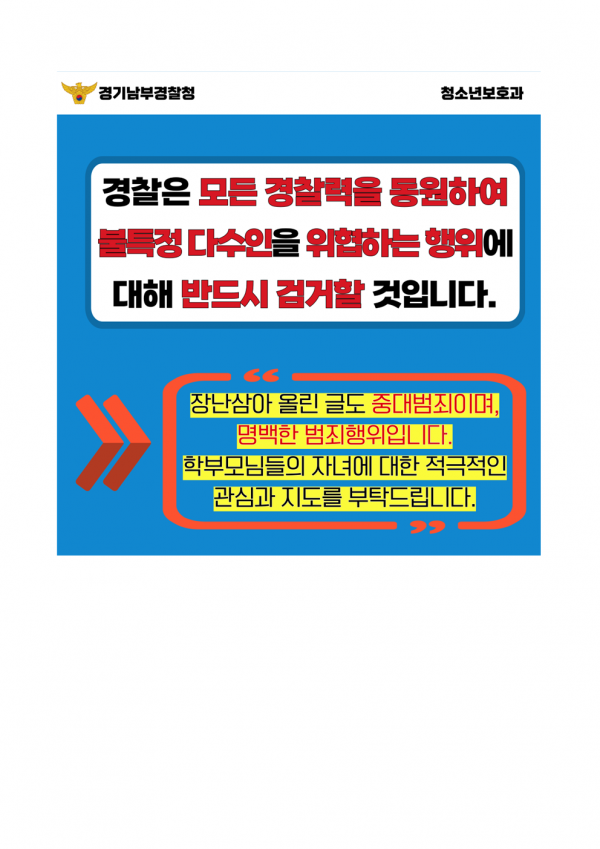특히 이번과 같은 폭발물 설치, 방화 협박 예고 글을 SNS나 커뮤니티 사이트 등에 게시하거나 거짓 신고하는 행위는 호기심, 장난 등 어떠한 이유를 불문하고 중대한 범죄임을 강조하며 교육지원청과 각 학교에서도 이와 관련된 교육을 철저히 할 예정이다을 안내했다.