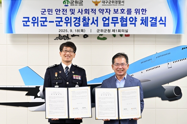 [한국Q뉴스] 군위군과 군위경찰서는 9월 18일 군위군청에서 군민 안전 및 사회적 약자 보호를 위한 업무협약을 체결하고 보다 안전한 지역사회 조성을 위해 상호 협력해 나가기로 했다.