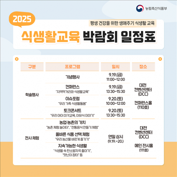 [한국Q뉴스] 농림축산식품부는 식생활에 대한 국민적 관심을 높이고자 9월 19일부터 20일까지 이틀간 대전컨벤션센터에서 ‘2025 식생활교육 박람회’를 개최한다.