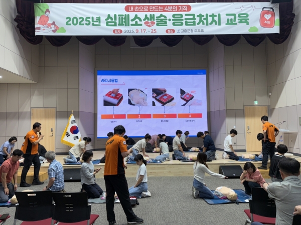 교육은 고흥군청 우주홀에서 총 8회에 걸쳐 진행되며 전 직원을 대상으로 △심폐소생술 △자동심장충격기 사용법 △기도 폐쇄 응급처치 요령 등을 포함한 이론과 실습 병행형 프로그램으로 운영된다.