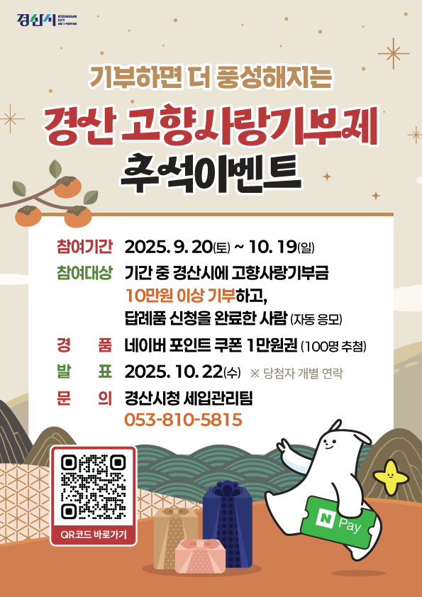 이벤트 대상은 기간 중에 경산시에 10만원 이상 기부하고 답례품을 선택한 기부자이며 기부자 중 100명을 무작위로 추첨해 1만원 상당의 네이버 포인트 쿠폰을 증정한다.