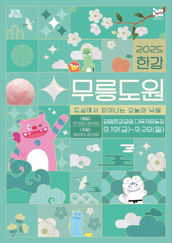 ‘2025 한강 무릉도원 축제’는 9월 19일부터 28일까지 잠원한강공원에서 개최되며 강남심포니오케스트라와 불꽃놀이로 꾸며지는 개막식, 퓨전 국악·탈춤 비보잉·재능기부 공연 등 다채로운 무대, 한복 체험과 전통 공예를 현대적으로 재해석한 ‘도원 공방’, 회전목마와 LED 조형물이 어우러진 ‘달빛 비원’, 대형 윷놀이와 야광 팽이 등 전통 놀이를 즐길 수 있는 ‘시간 여행형 놀이존’ 이 마련된다.