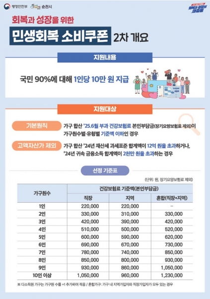 특히 2차 소비쿠폰은 사용 편의를 확대하기 위해 기존 사용처 외에도 읍·면 지역 하나로마트 및 파머스마켓과 순천 로컬푸드 직매장까지 이용 가능하도록 했다.