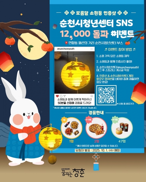 [한국Q뉴스] 순천시 청년센터는 공식 SNS 가입자가 1만 2천 명을 돌파함에 따라 청년과 시민들의 성원에 보답하기 위해 기념 이벤트를 진행한다고 밝혔다.